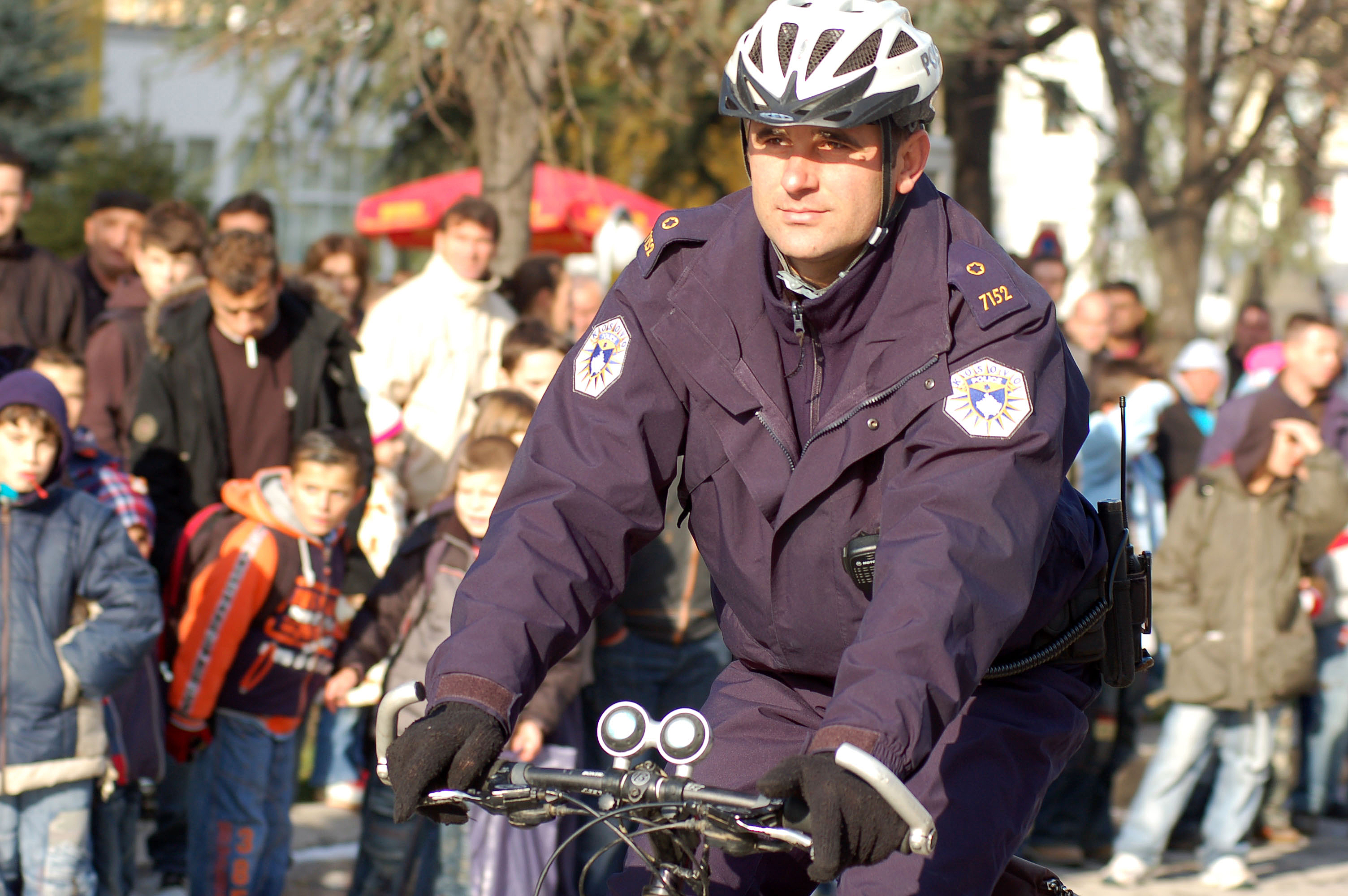 Kosovo Police officers parade on bicycles watched by hundreds of school children attending the Open Day event supported by the OSCE Mission in Kosovo, Gjilan/Gnjilane 20 November 2007.