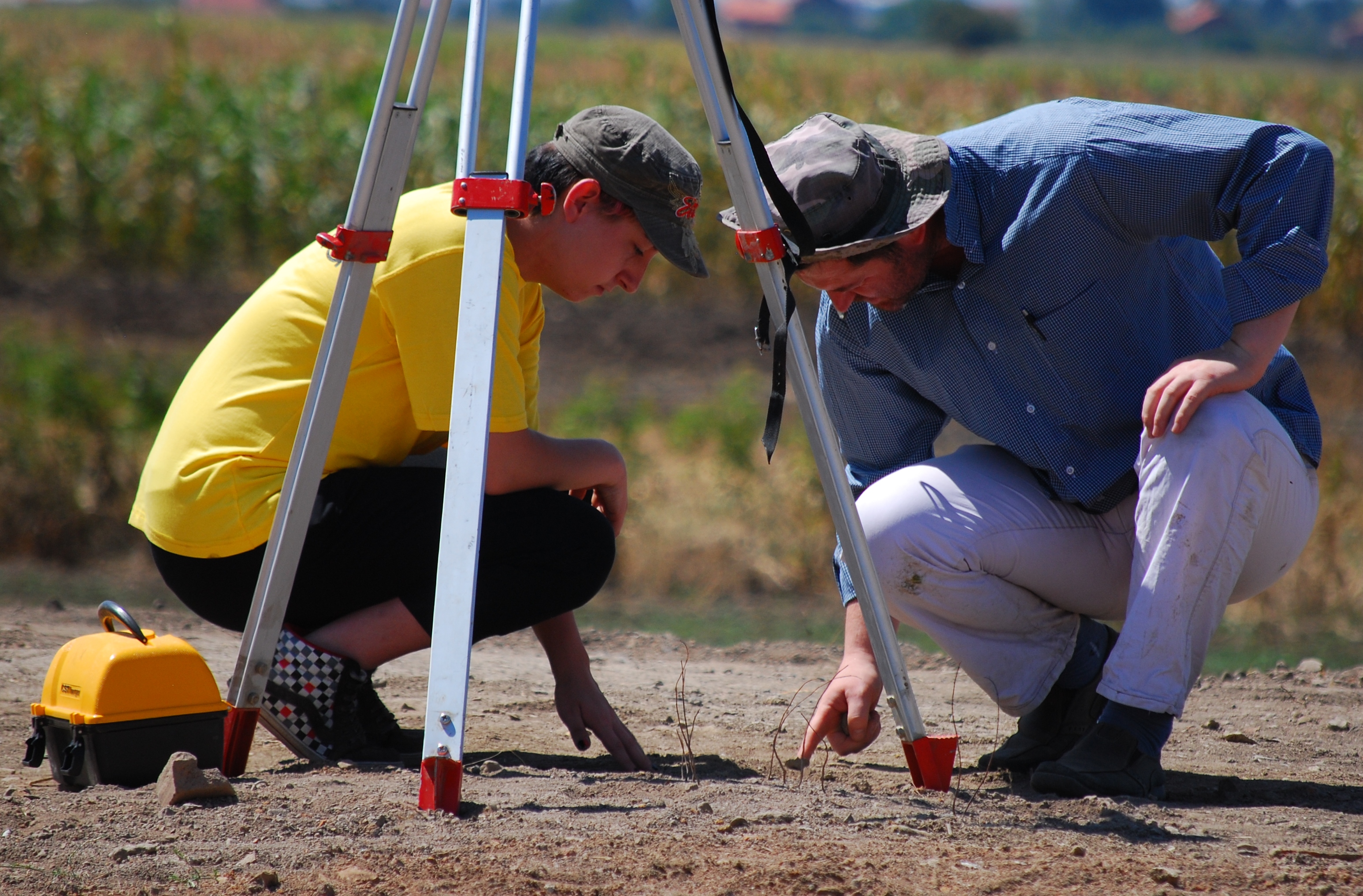 A youth camp participant and an archaeologist examine the ground at the historic site of Ulpiana, central Kosovo, looking for artefacts, 22 August 2011.