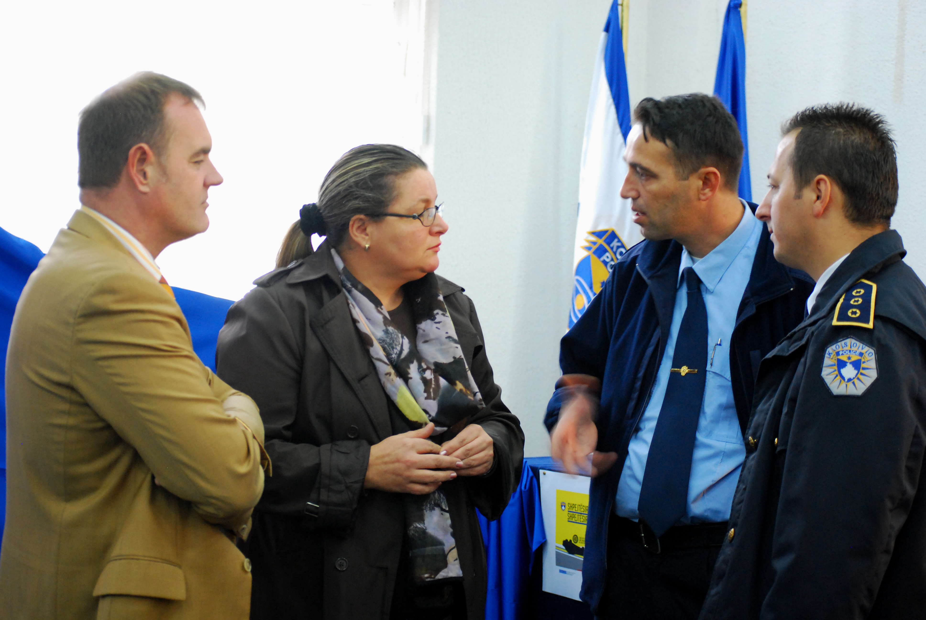 Carsten Twelmeier (l), the Director of the OSCE Mission's Department for Security and Public Safety, and Mission member Shpresam Mulliqi (c), speak to Kosovo police representatives at a press conference to launch a traffic safety campaign organised by the OSCE Mission, in co-operation with Kosovo police, Prishtine/Pristina, 26 October 2011.
