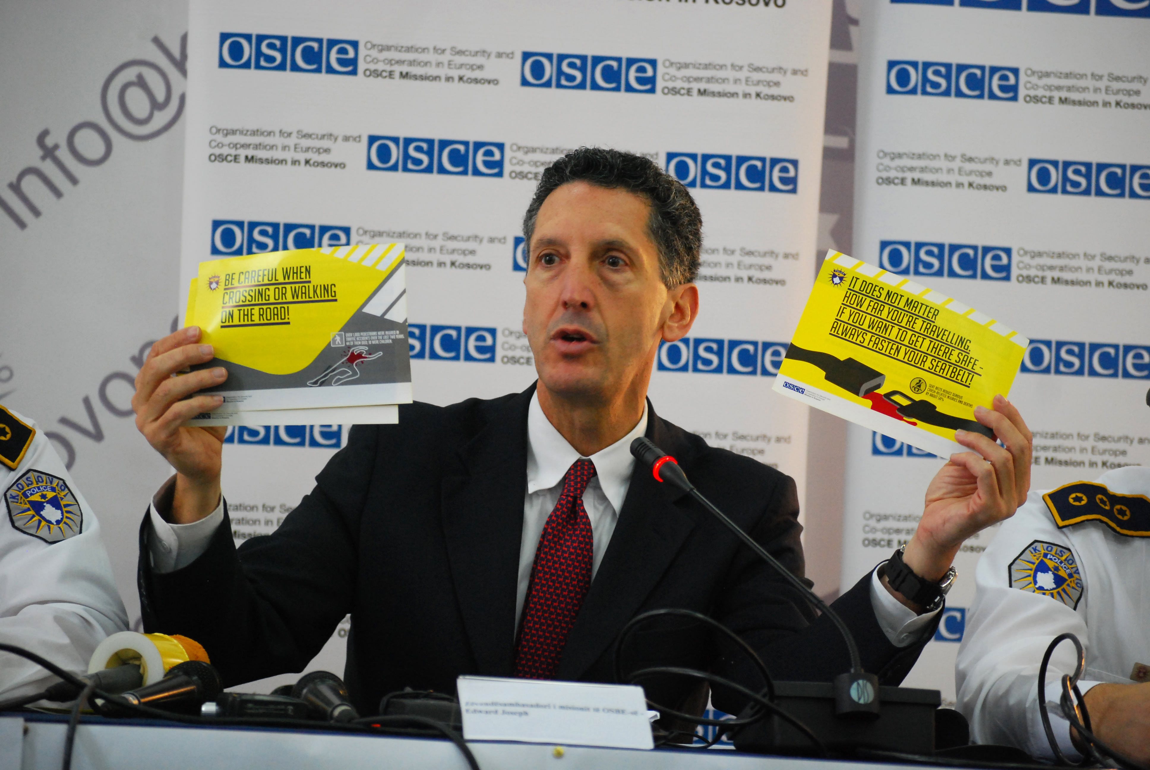 The Deputy Head of the OSCE Mission in Kosovo, Edward Joseph, displays leaflets at the launch of a traffic safety campaign organised by the OSCE Mission and the Kosovo police, Prishtine/Pristina, 26 October 2011.