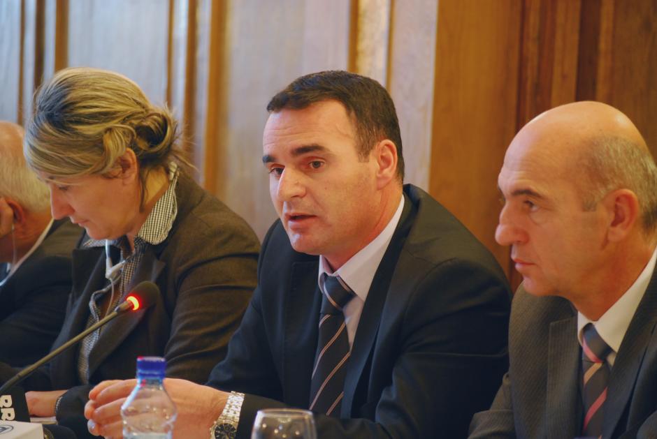 Participants talk at a roundtable discussion for judges, prosecutors, lawyers, police and advocates of human trafficking victims, organized by the OSCE Mission in Kosovo, Prishtinë/Priština, 2 November 2011.
