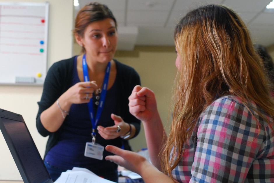 Rina Toprlak (r), a deaf person employed by the OSCE Mission in Kosovo for three days, as part of an initiative to demonstrate the skills of people with disabilities to potential employers, discusses her tasks with Zana Preniqi, her interpreter, Prishtinë/Priština, 21 October 2011.