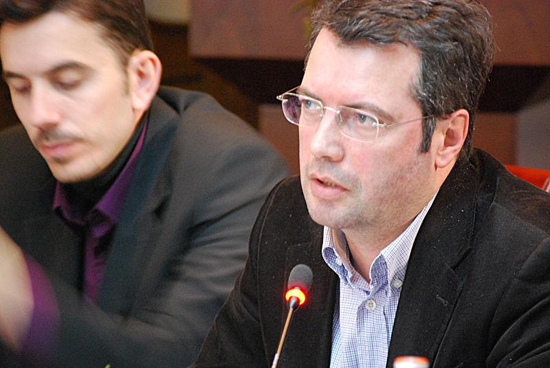 Agron Bajrami, kryeredaktor i së përditshmes Koha Ditore dhe anëtar i Bordit të Këshillit për Media të Shkruara të Kosovës duke folur në konferencën për vetë-rregullimin e mediave të organizuar nga OSBE, Prishtinë, 1 dhjetor 2011.