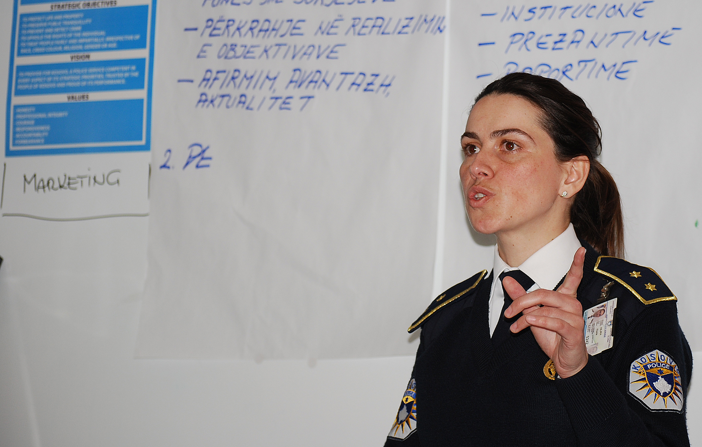 Kosovo Police Officer Major Florije Hajra presents her working group's conclusions at a training course on strategic marketing for police, run by the Austrian Development Agency with the OSCE Mission's support, Vushtrri/Vucitrn, 15 April 2008.