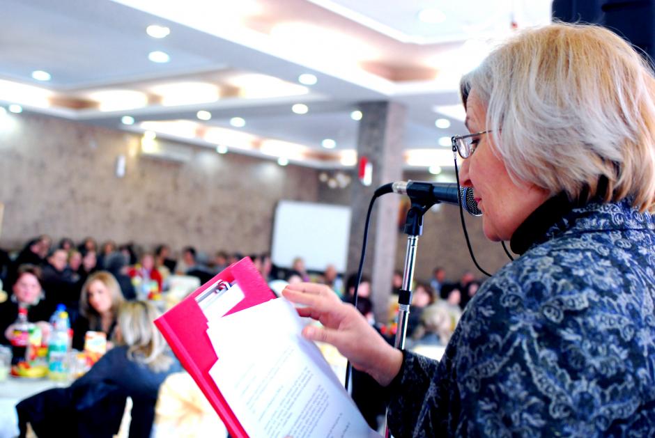 Habibe Haxhimustafa, Co-ordinator of the Municipal Human Rights Unit in Rahovec/Orahovac, welcomes guests to a joint reception with the OSCE Mission in Kosovo and Rahovec/Orahovac municipality to award successful women in various businesses and the public sector on International Women’s Day, Rahovec/Orahovac, 8 March 2012.