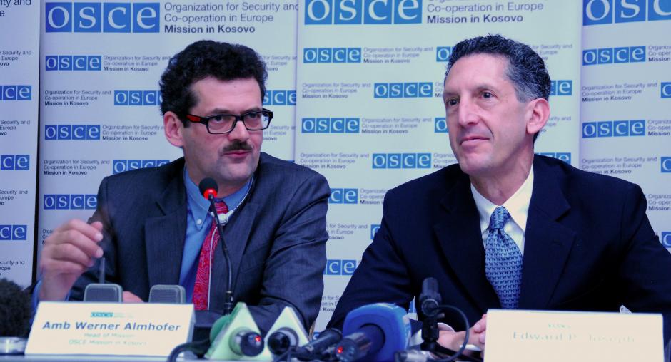 The Head of the OSCE Mission in Kosovo, Ambassador Werner Almhofer (l) alongside the Deputy Head of the Mission, Edward Joseph, speaking at a press conference on the OSCE's ballot facilitation exercise, Prishtinë/Priština, 3 May 2012. (OSCE/Hasan Sopa) Photo details