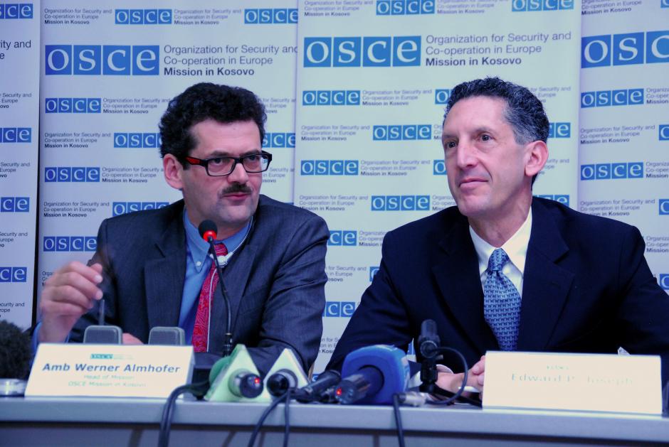 The Head of the OSCE Mission in Kosovo, Ambassador Werner Almhofer (l) alongside the Deputy Head of the Mission, Edward Joseph, speaking at a press conference on the OSCE's ballot facilitation exercise, Prishtinë/Priština, 3 May 2012.