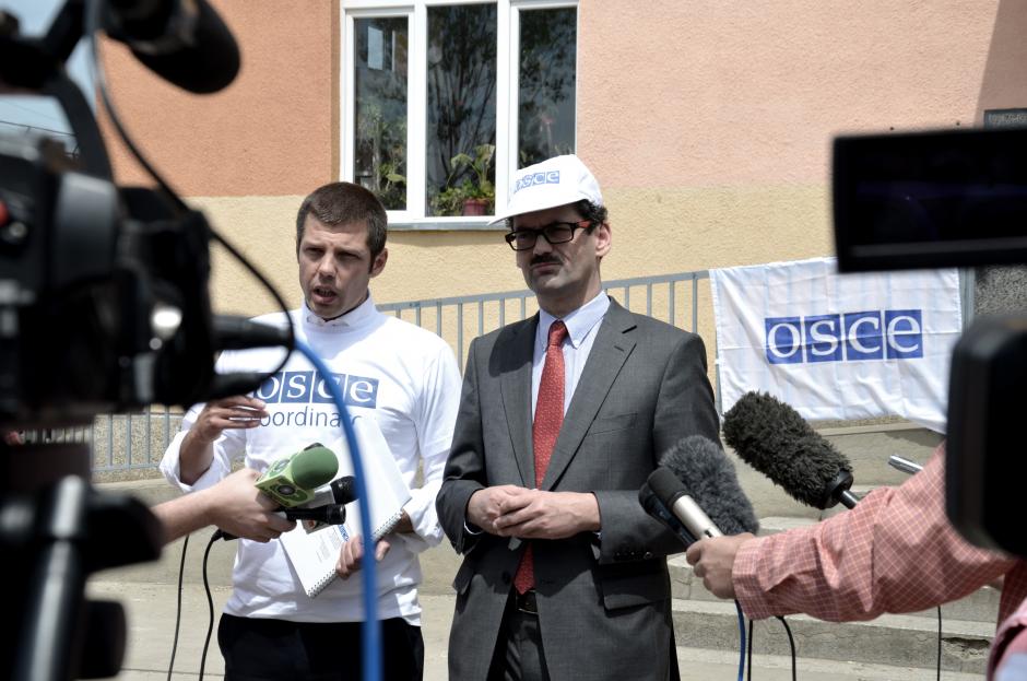 Head of the OSCE Mission in Kosovo, Ambassador Werner Almhofer, speaks to journalists outside a polling station in Gracanica/Graçanicë, 6 May 2012.
