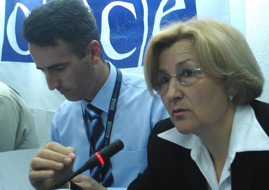 Habibe Haxhimustafa (right), municipal gender officer, speaks at an OSCE Mission-supported local roundtable on women's participation in public and political life, Rahovec/Orahovac municipality, southern Kosovo, 9 May 2008.