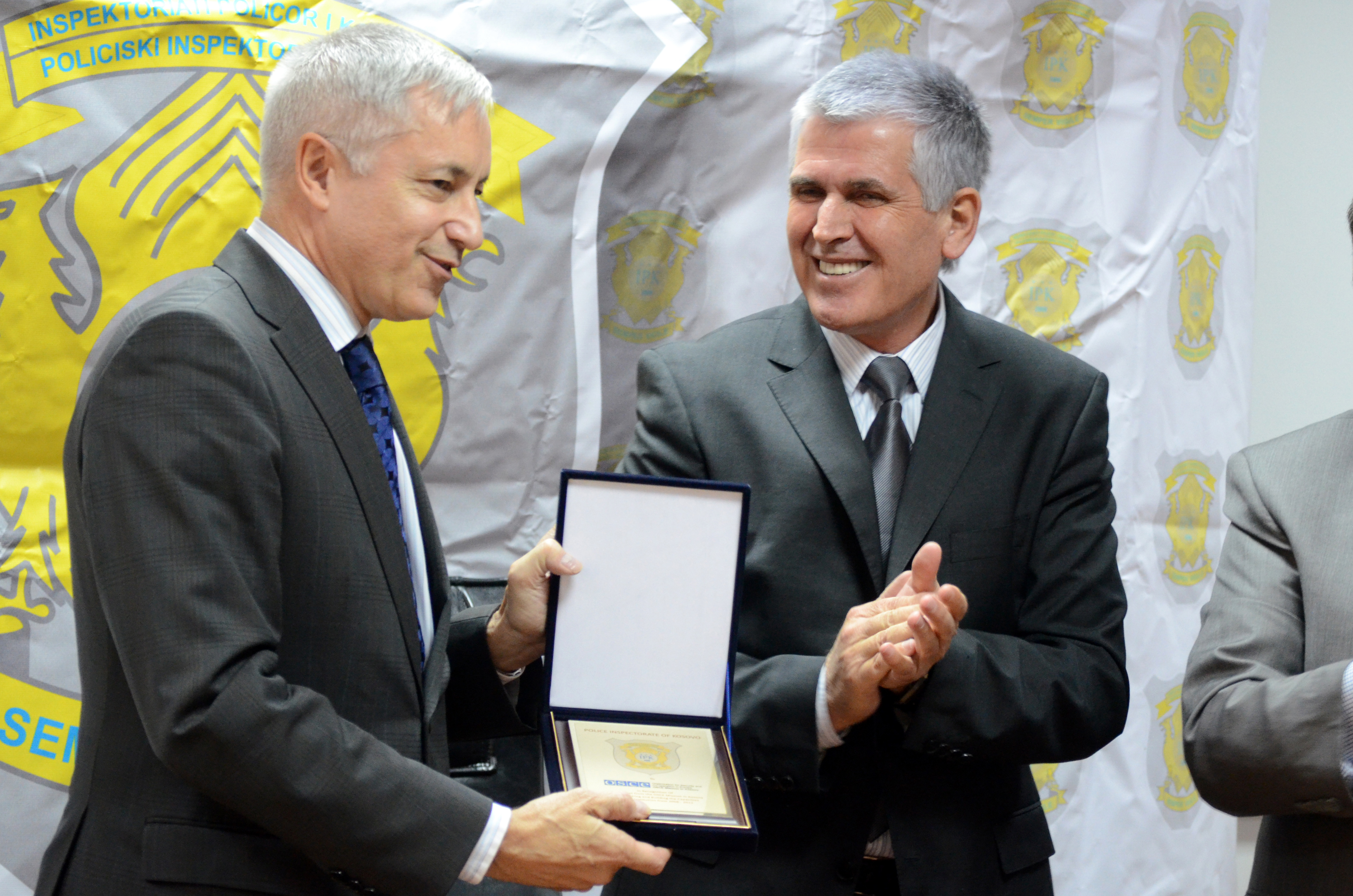 Kosovo's Minister of Interior Affairs, Bajram Rexhepi (r), presents a certificate of appreciation to the Head of the OSCE Mission in Kosovo, Jean-Claude Schlumberger (l), at the end of a press conference marking the conclusion of the Mission’s direct-support programme to the Police Inspectorate of Kosovo, Prishtine/Prishtina, 12 October 2012.