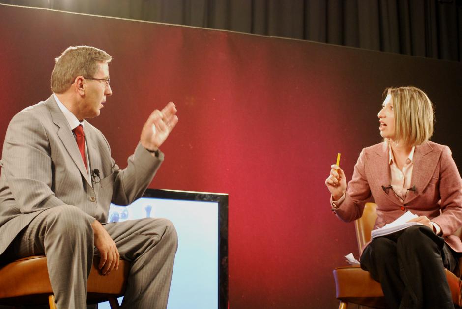 Nexhmedin Arifi (l), Mayor of Viti, and Jeta Xharra (r), the moderator of the Kosovo TV show 'Jeta ne Kosove' (Life in Kosovo), take part in one of a series of OSCE-supported televised debates to take place in 27 Kosovo municipalities, 23 September 2008.