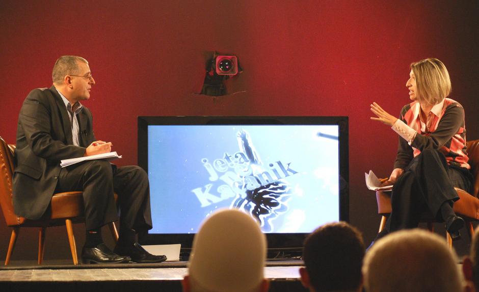 Xhabir Zharku (l), Mayor of Kacanik, and Jeta Xharra (r), moderator of the Kosovo TV show 'Jeta ne Kosove' (Life in Kosovo), take part in one of a series of OSCE-supported televised debates to take place in 27 Kosovo municipalities, 23 September 2008.
