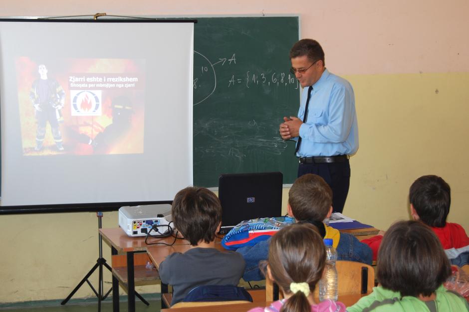 Firefighter trainer Bajram Rexhepi gives a lecture to children from the 'Dardania' primary school as part of an OSCE project on fire protection education, to be implemented in five other schools in the Prishtine/Pristina region, 10 October 2008.