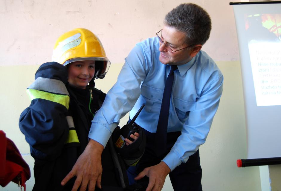 Firefighter trainer Bajram Rexhepi helps a child from the 'Dardania' primary school try on a firefighter's uniform at an OSCE project on fire protection education, to be implemented in five other schools in the Pristina region, 10 October 2008.