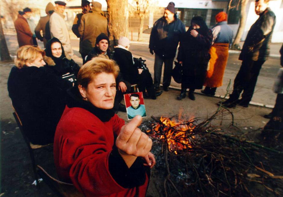 A woman in Kosovo shows a photo of her lost husband, January 1999.