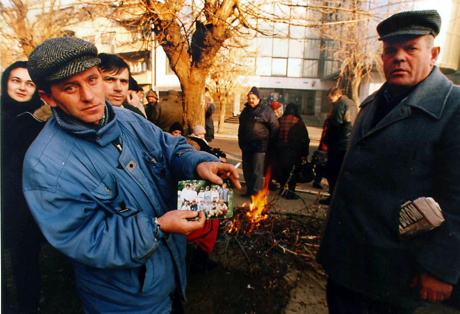 Families in Kosovo meet around a fire and mourn relatives lost during the crisis, January 1999.