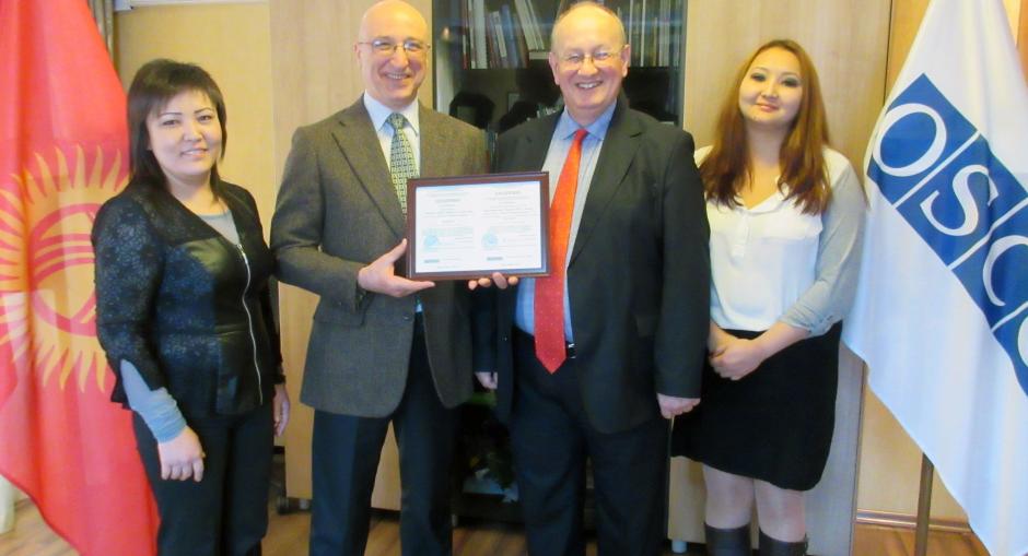 (солдон - оңго) ЕККУнун Борборунун укуктук маселелер боюнча улуттук кеңешчиси Индира Сатаркулова жана Борбордун Башчысы – элчи Сергей Капинос магистердик программанын жаңы лицензиясын ЕККУнун Бишкектеги Академиясынын Директору Пал Дунай жана анын орун басары Гульнура Торалиевага тапшырууда, Бишкек, 18-февраль, 2016 ж.