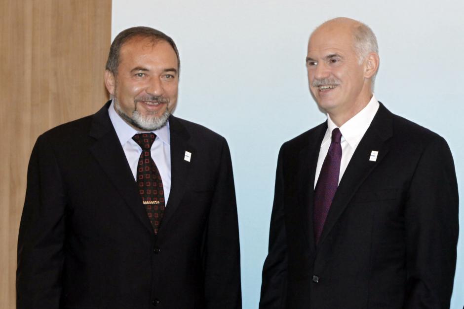 Israel's Foreign Minister Avigdor Liebermann (l) is greeted by Greek Prime Minister and OSCE Chairman-in-Office George Papandreou at the opening of the 17th OSCE Ministerial Council, Athens, 1 December 2009.