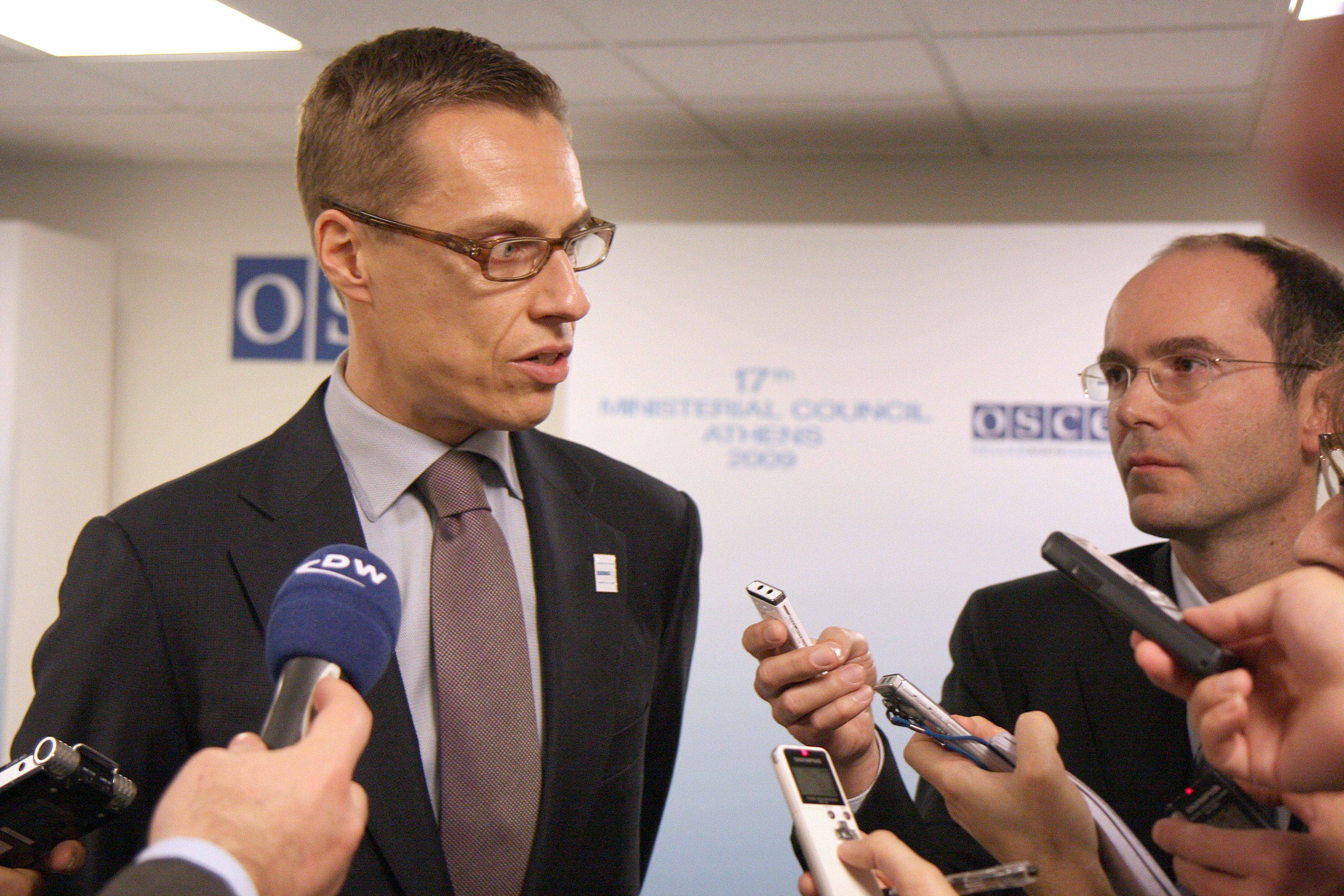 Finland's Foreign Minister Alexander Stubb speaks to journalists at a press briefing during the 17th OSCE Ministerial Council in Athens, 1 December 2009.