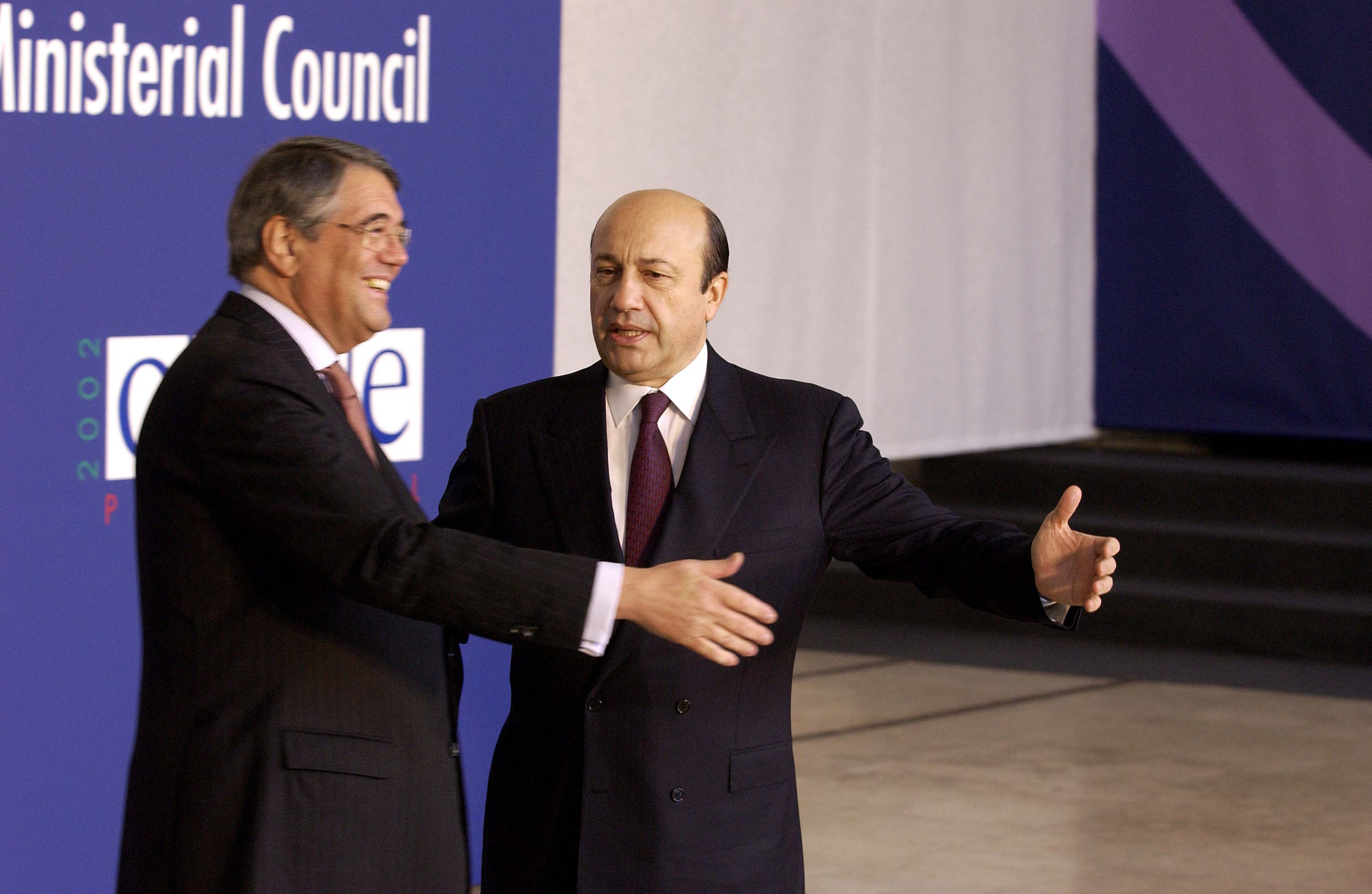 The OSCE Chairman-in-Office, Portuguese Foreign Minister Antonio Martins da Cruz (left), and his Russian counterpart Igor Ivanov at the Ministerial Council in Porto, 6 December 2002.