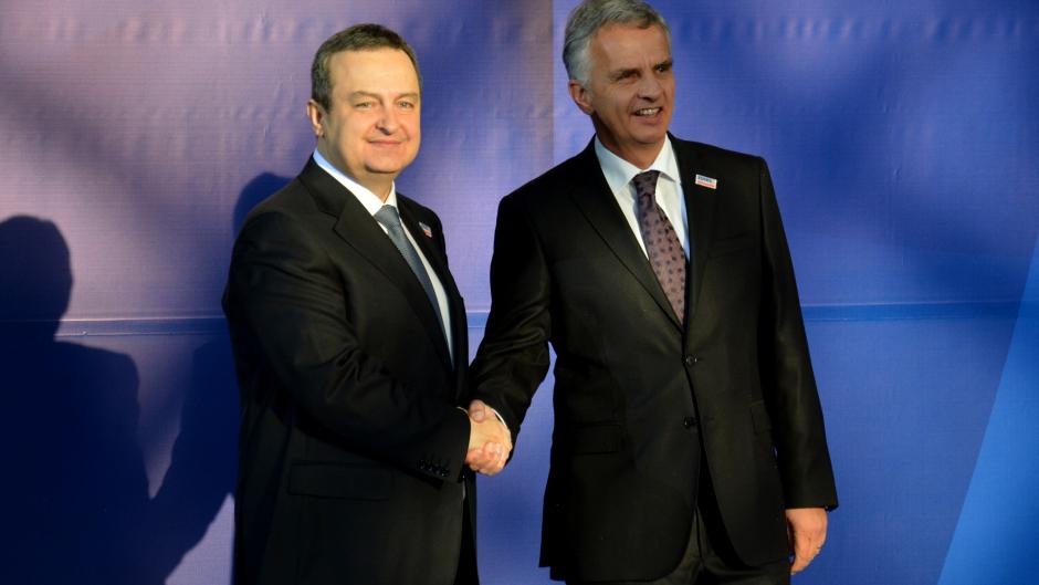 OSCE Chairperson-in-Office, Serbia’s Foreign Minister Ivica Dačić, greets the Swiss Foreign Minister and President of the Confederation Didier Burkhalter, at the start of the 22nd OSCE Ministerial Council in Belgrade, 3 December 2015.