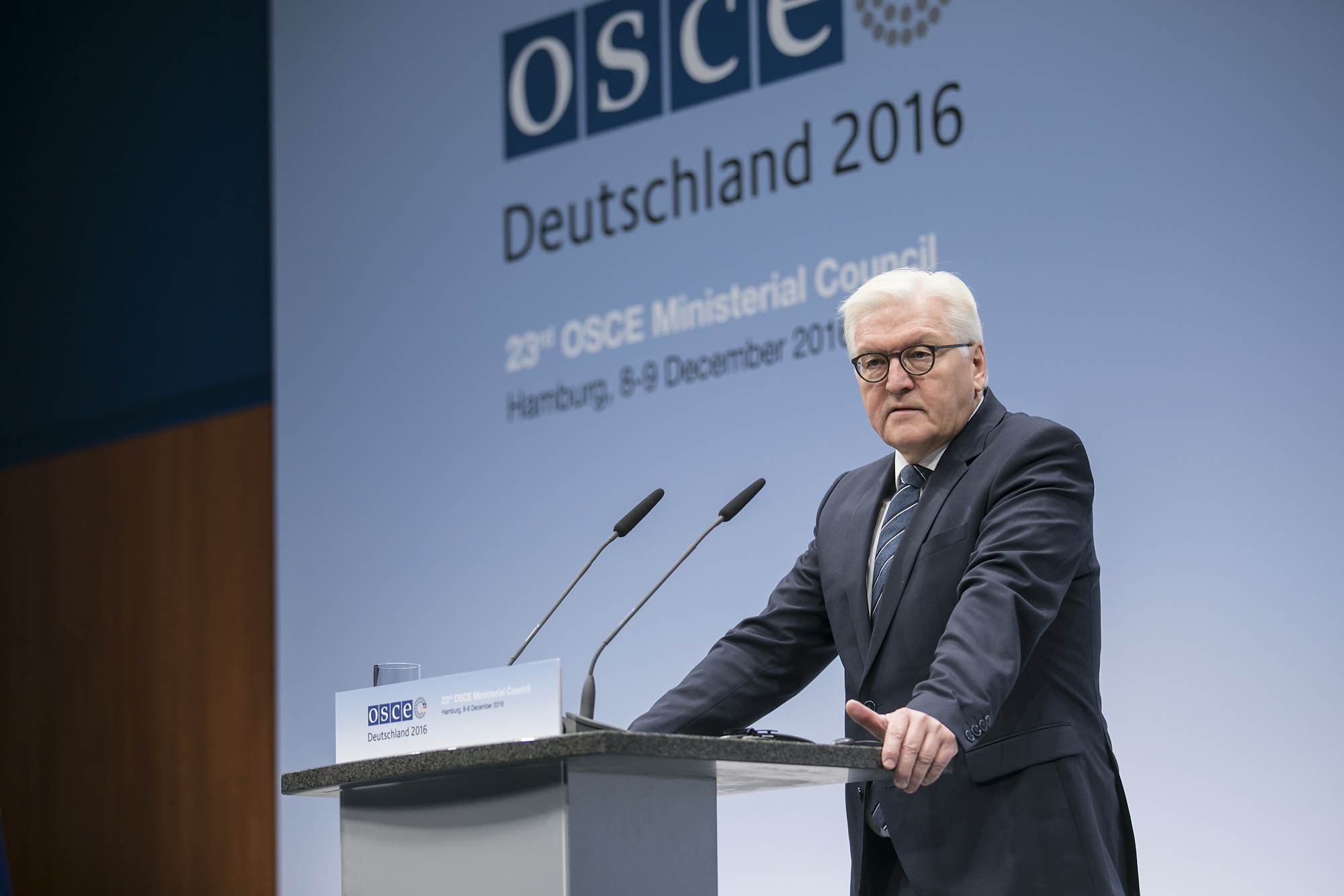 2016 OSCE Chairperson-in-Office and German Foreign Minister Frank-Walter Steinmeier at the opening press conference of the 23rd OSCE Ministerial Council, Hamburg, 8 December 2016.