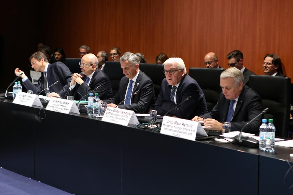 (R-l) Minister of Foreign Affairs of France Jean-Marc Ayrault, OSCE Chairperson-in-Office and German Foreign Minister Frank-Walter Steinmeier, Head of the Federal Department of Foreign Affairs of Switzerland Didier Burkhalter, and OSCE Secretary General Lamberto Zannier at the side event on arms control on the margins of the 23rd OSCE Ministerial Council, Hamburg, 8 December 2016.