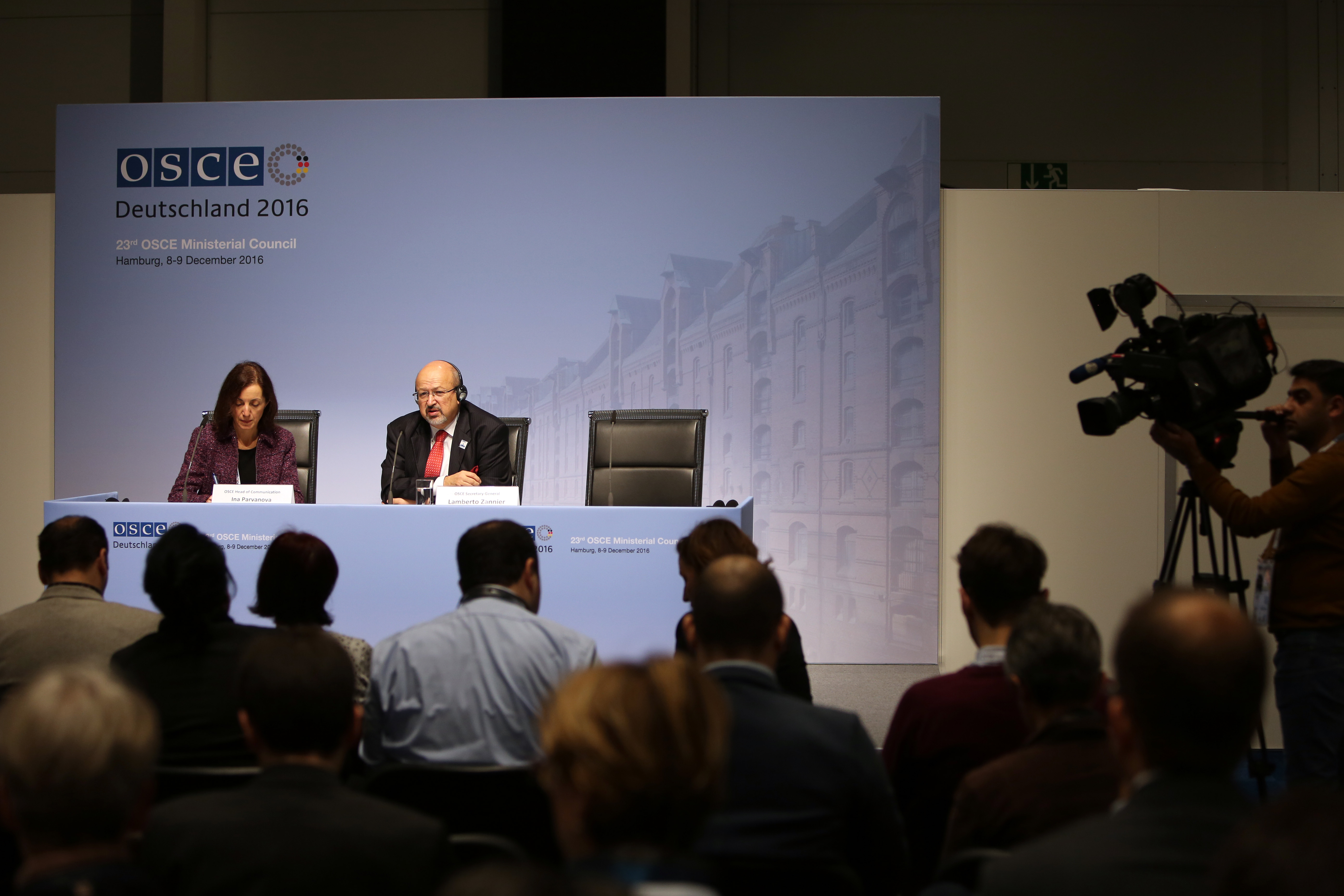 OSCE Secretary General Lamberto Zannier (r) at a press briefing during the 23rd Ministerial Council in Hamburg, 9 December 2016.
