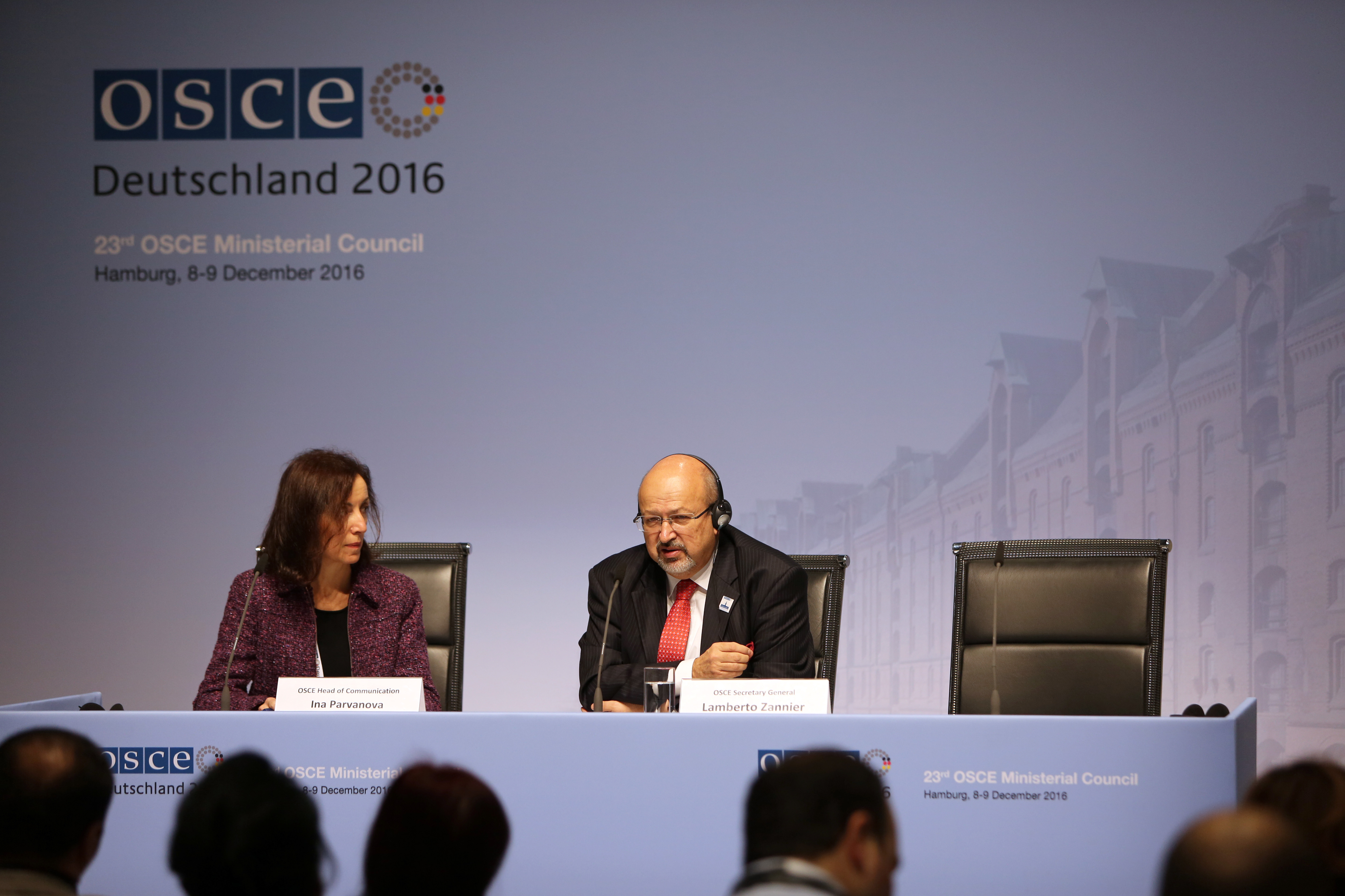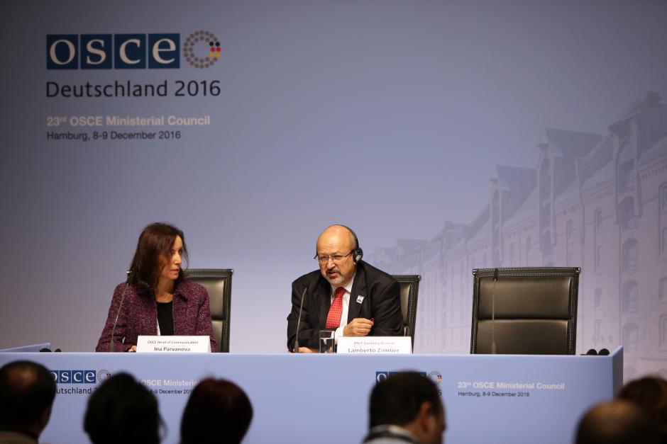 OSCE Secretary General Lamberto Zannier (r) at a press briefing during the 23rd Ministerial Council in Hamburg, 9 December 2016.