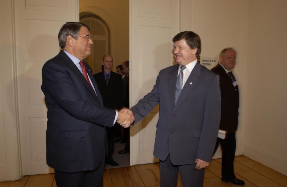 OSCE's Chairman-in-Office, Portuguese Foreign Minister Antonio Martins da Cruz (left) and Belarussian Foreign Minister Mikhail Khvostov, in Porto, 5 December 2002.