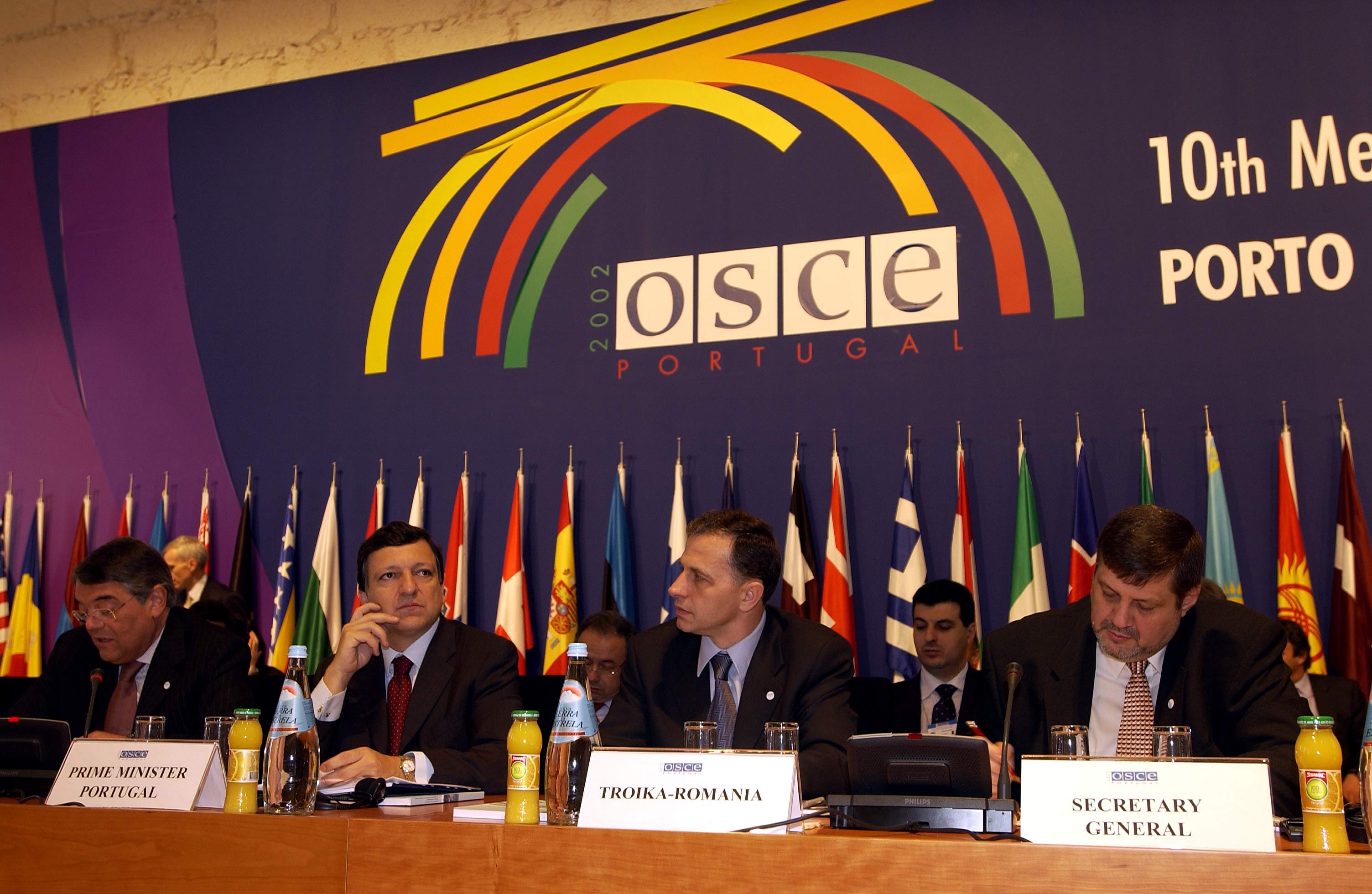 The OSCE Chairman-in-Office, Portuguese Foreign Minister Antonio Martins da Cruz (left), opening the Ministerial Council in Porto, 6 December 2002.