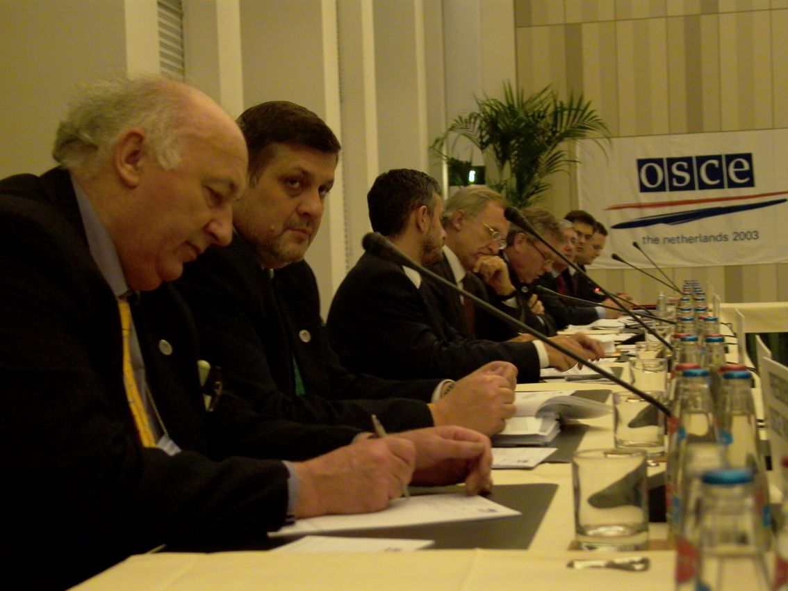 OSCE Parliamentary Assembly President Bruce George (left) and Secretary General Jan Kubis, at the OSCE Troika meeting with Mediterranean Partners for Co-operation, Maastricht, 1 December 2003.