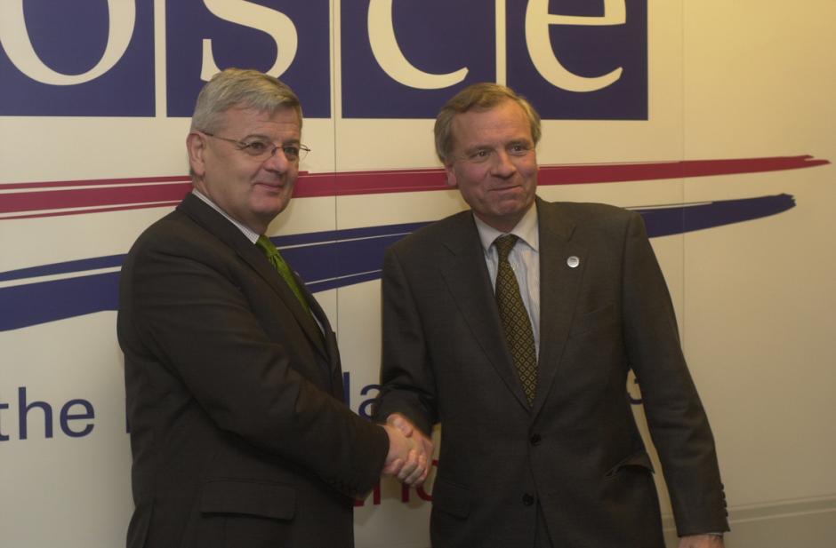 OSCE Chairman-in-Office de Hoop Scheffer (right) welcomes German Foreign Minister Joschka Fischer to the Maastricht Ministerial Council, 1 December 2003.