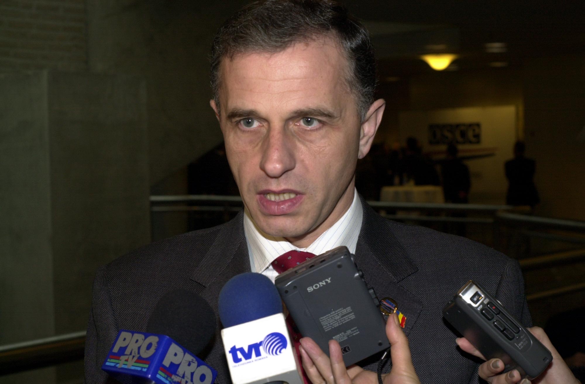 Romanian Foreign Minister Mircea Dan Geoana, OSCE Chairman-in-Office in 2001, speaking to the press at the Maastricht Ministerial Council meeting, 1-2 December 2003.