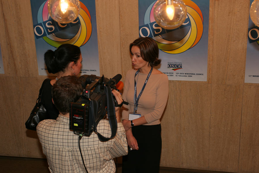 Bulgarian Deputy Foreign Minister Gergana Grancharova speaks to journalists during the OSCE Ministerial Council in Sofia, 5 December 2004. Bulgaria held the OSCE Chairmanship in 2004.