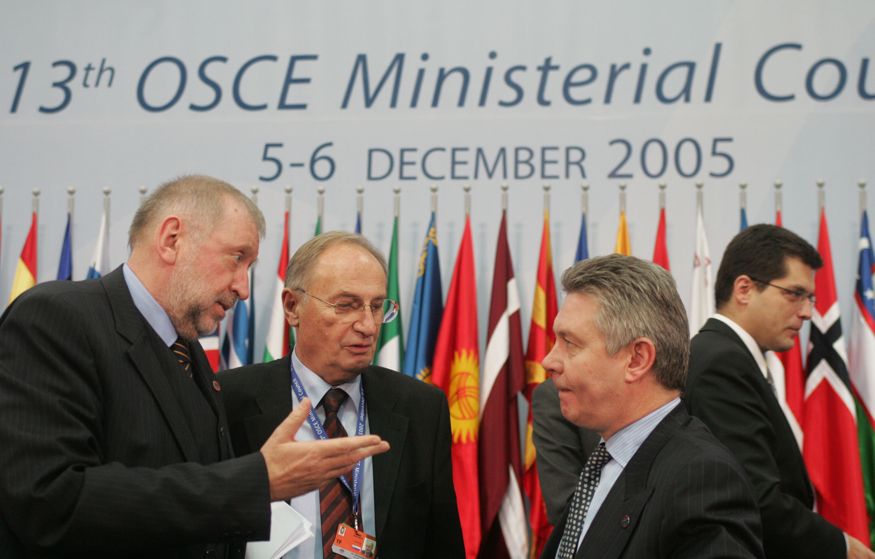 OSCE Chairman-in-Office Dimitrij Rupel (left) talks to Belgian Foreign Minister Karel De Gucht (right), who will succeed him as CiO in 2006, at the 13th Ministerial Council in Ljubljana, 6 December 2005.