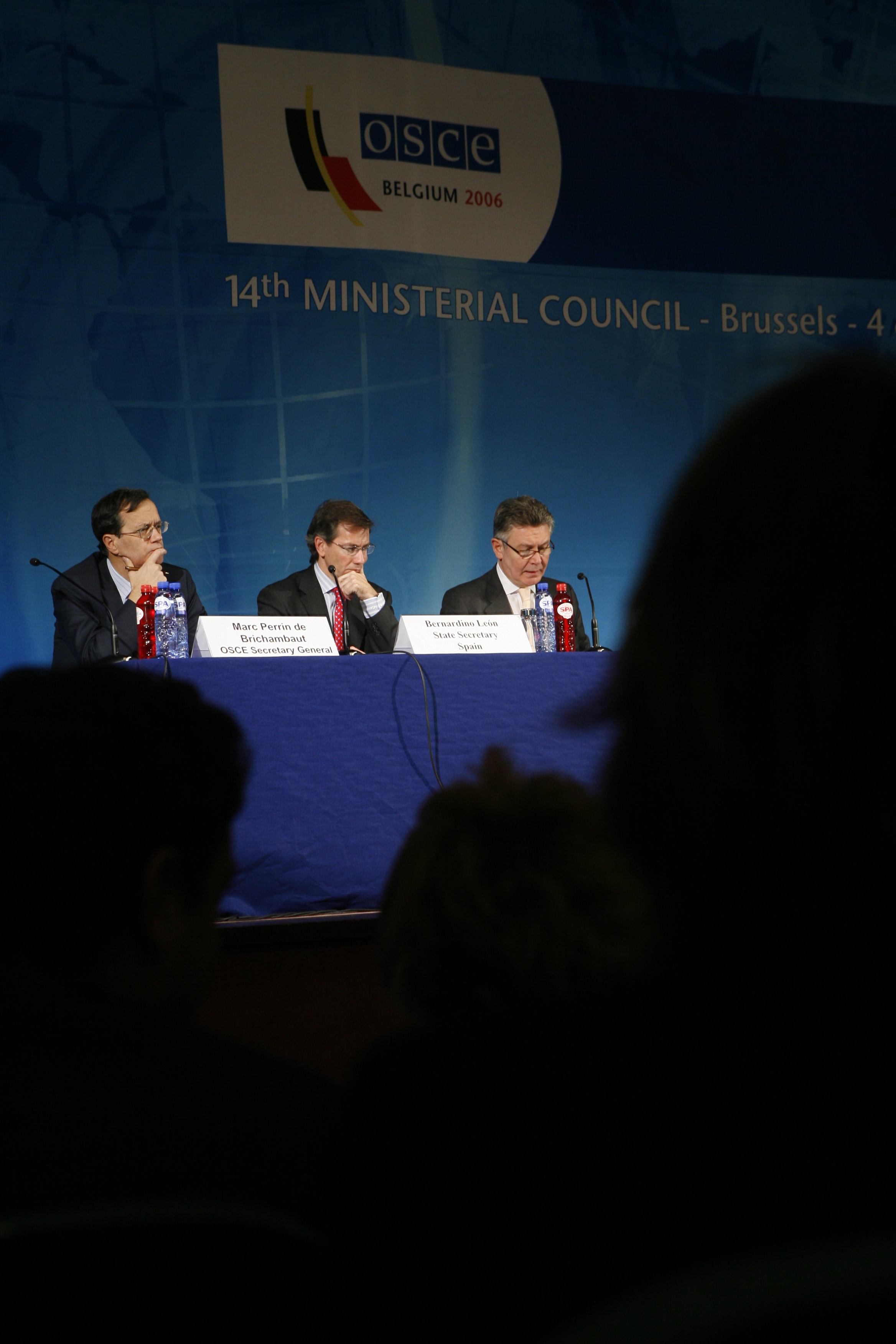 OSCE Chairman-in-Office Karel De Gucht (right), Secretary General Marc Perrin de Brichambaut (left) and Spain's State Secretary Bernardino Leon at a news conference at the end of the 14th OSCE Ministerial Council in Brussels, 5 December 2006.
