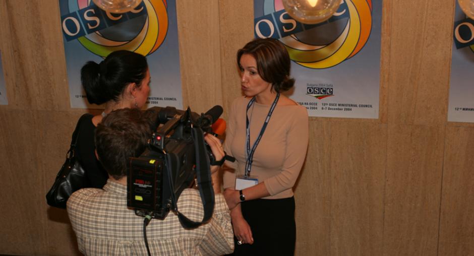 Bulgarian Deputy Foreign Minister Gergana Grancharova speaks to journalists during the OSCE Ministerial Council in Sofia, 5 December 2004. Bulgaria held the OSCE Chairmanship in 2004. (OSCE/Svetoslav Stanchev)