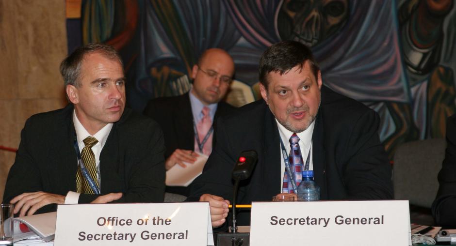 OSCE Secretary General Jan Kubis speaks at the OSCE Ministerial Council in Sofia. To the left is Didier Fau, Director of the Office of the Secretary General, 5 December 2004. (OSCE/Svetoslav Stanchev)