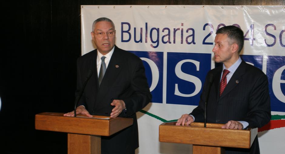 United States Secretary of State Colin Powell (left) and OSCE Chairman-in-Office Solomon Passy held a joint press conference at the OSCE Ministerial Council, Sofia, 7 December 2004. (OSCE/Svetoslav Stanchev)
