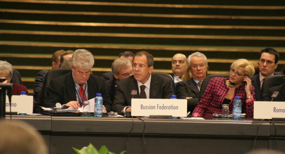 Russian Foreign Minister Sergey Lavrov speaking during a plenary session of the OSCE Ministerial Council. To the left is his Deputy Vladimir Chizov. Sofia, 7 December 2004. (OSCE/Svetoslav Stanchev)