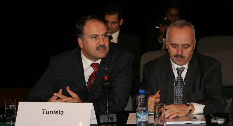 Tunisian European Affairs State Secretary, Hatem Ben Salem (left), at the OSCE Ministerial Council in Sofia, 5 December 2004. (OSCE/Svetoslav Stanchev)