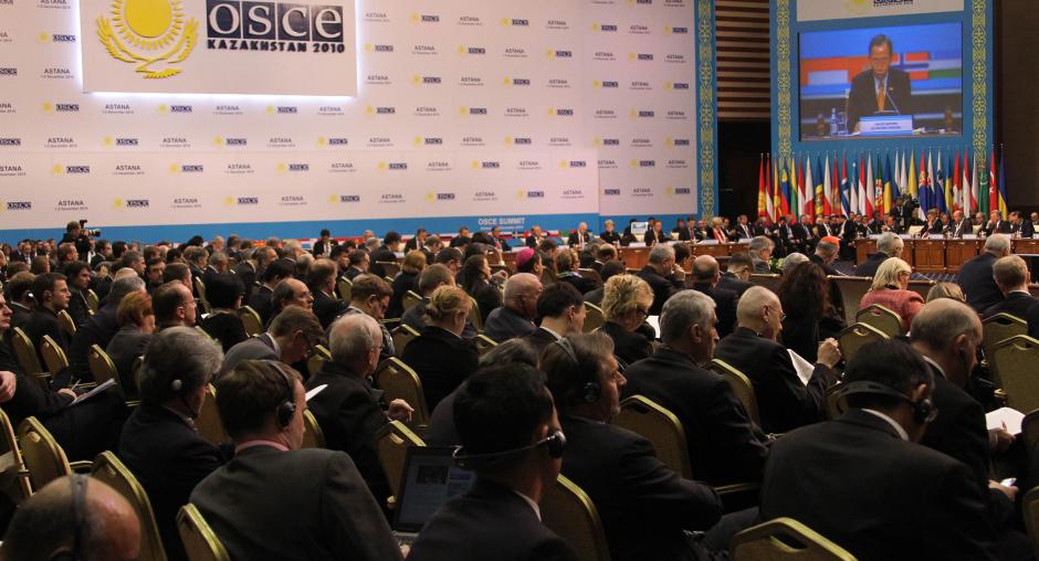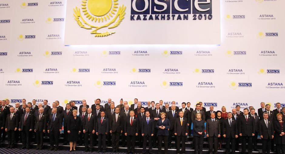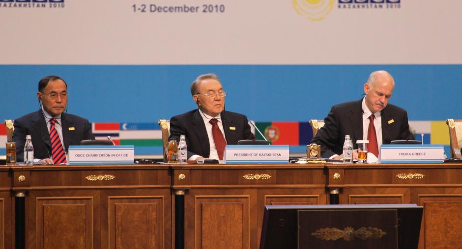 L-r: OSCE Chairperson-in-Office and Kazakhstan's Foreign Minister Kanat Saudabayev, President of Kazakhstan Nursultan Nazarbayev, and Prime Minister of Greece George Papandreou, Astana, 1 December 2010. (OSCE/Vladimir Trofimchuk)