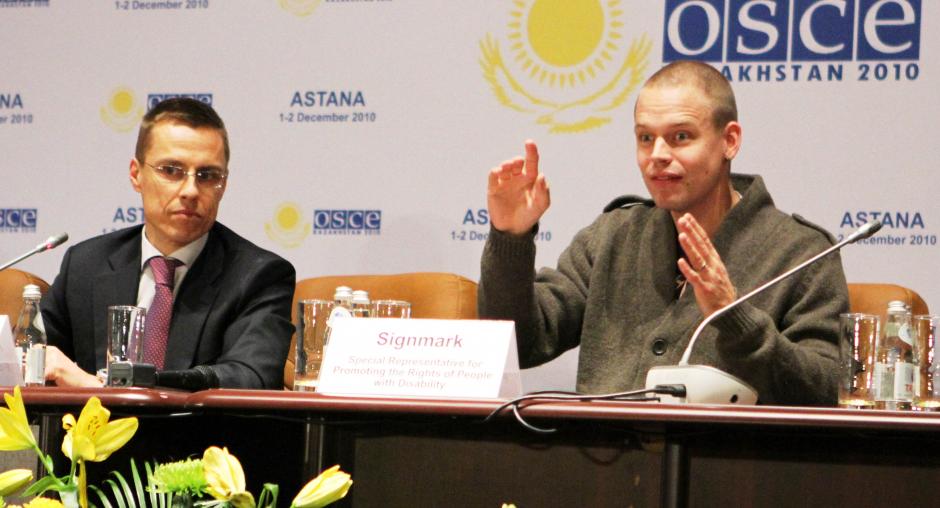 Alexander Stubb (l), Finnish Foreign Minister, with Signmark, a deaf rapper who serves as Stubb's special representative for promoting the rights of people with disability, Astana, 1 December 2010. (OSCE/Susanna Lööf)