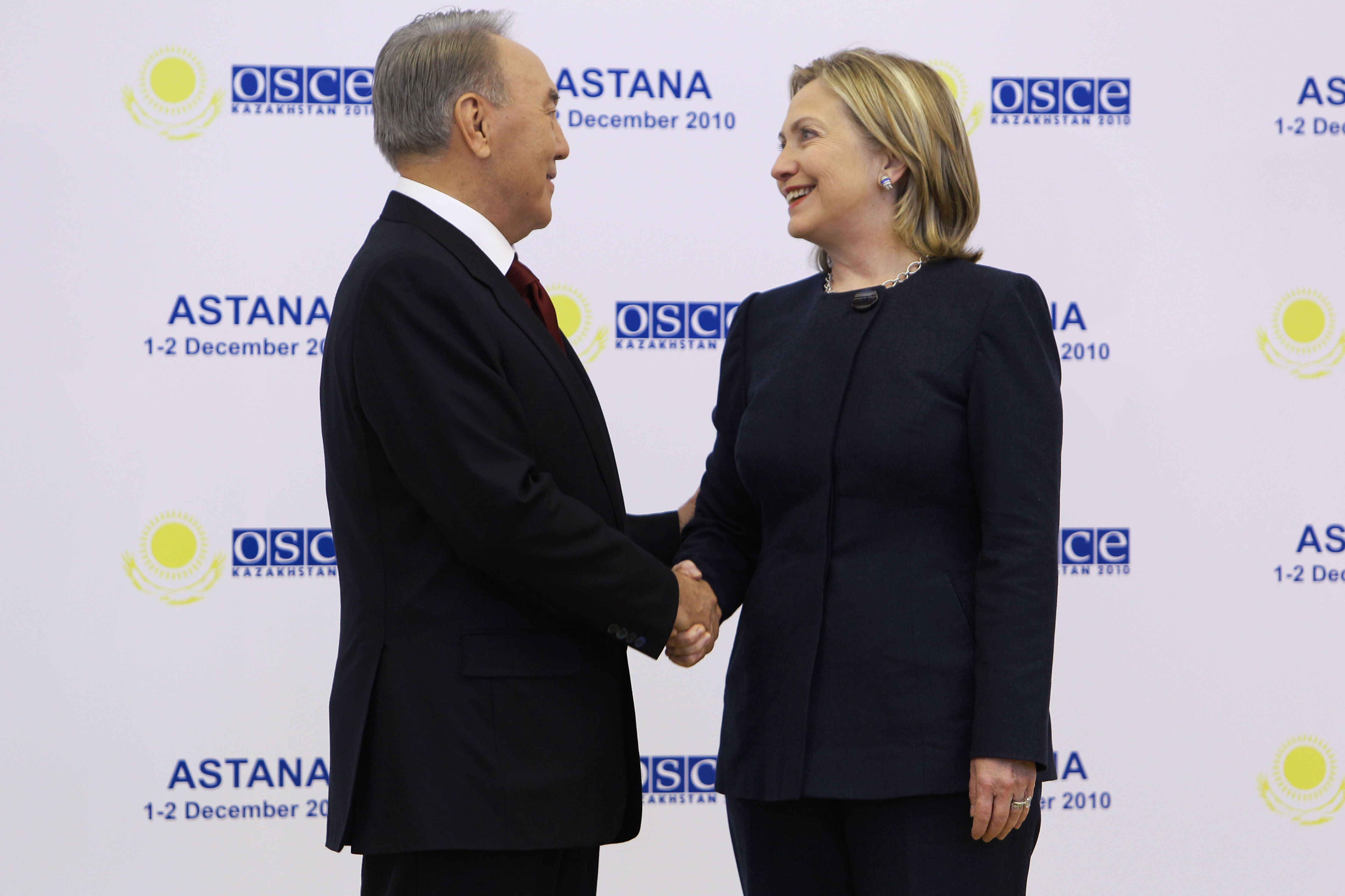 U.S. Secretary of State Hillary Clinton is greeted by Kazakhstan’s President Nursultan Nazarbayev at the opening of the OSCE Summit in Astana, 1 December 2010.