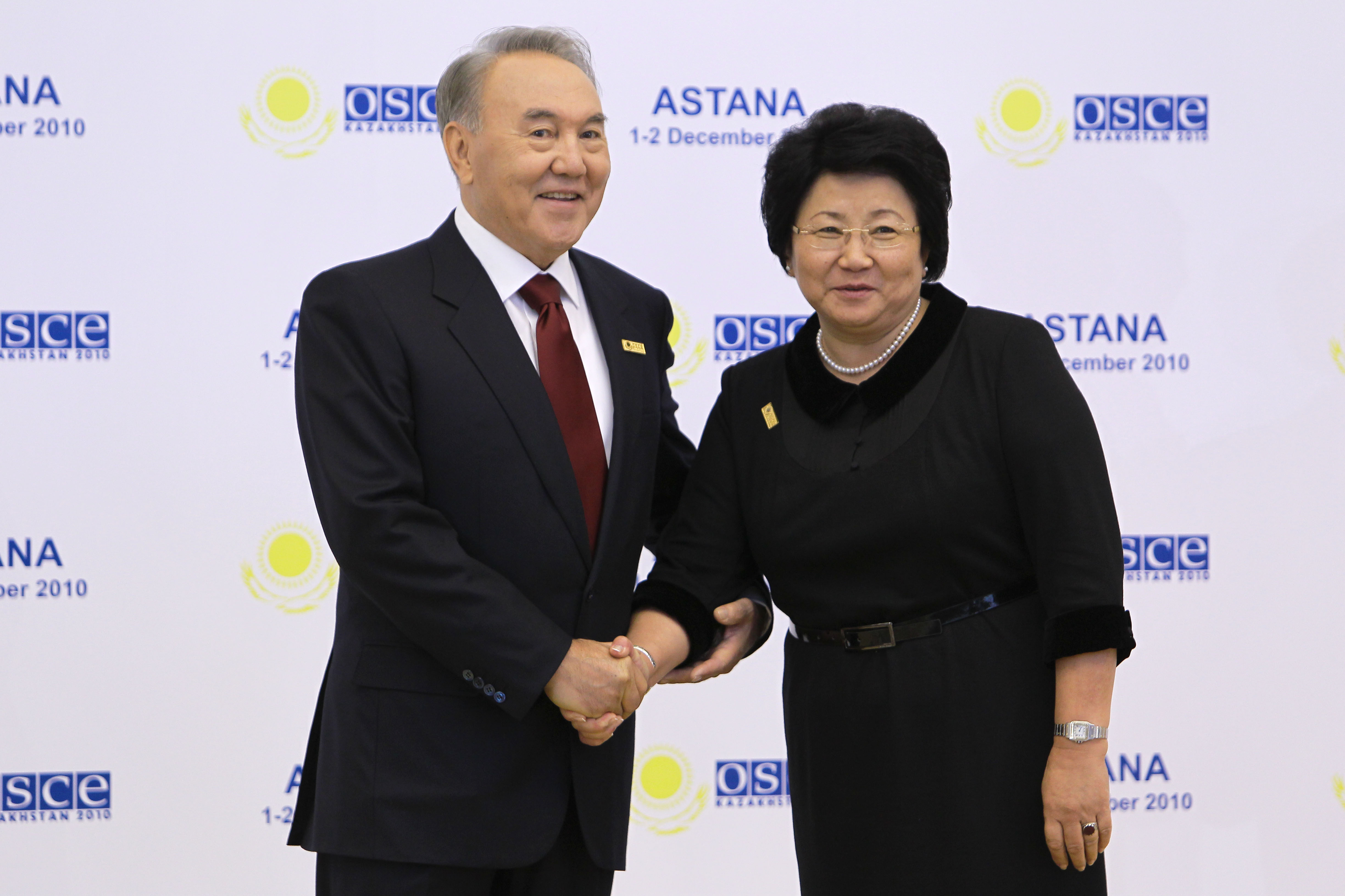 Roza Otunbaeva, President of the Kyrgyz Republic, is greeted by Kazakhstan’s President Nursultan Nazarbayev at the opening of the OSCE Summit in Astana, 1 December 2010.