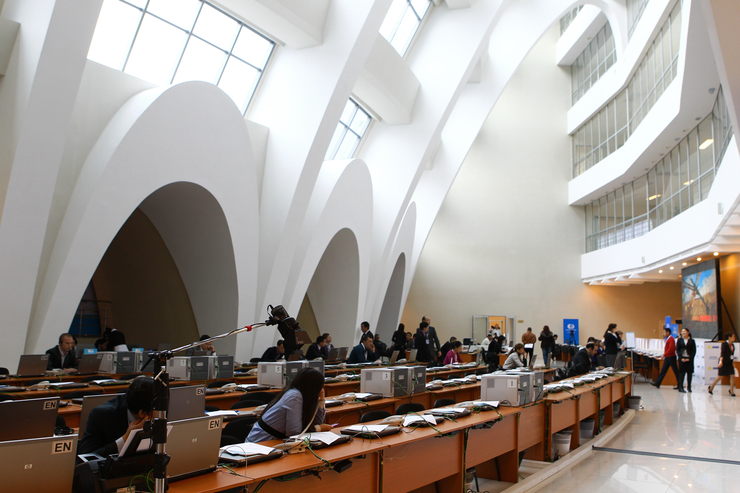Working space for journalists in the Summit Media Centre, Astana, 26 November 2010.