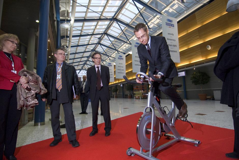 OSCE Chairman-in-Office and Finnish Foreign Minister Alexander Stubb tries out an exercise cycle during a walkthrough at the Helsinki Fair Centre, 1 December 2008, where the 16th OSCE Ministerial Council will be held on 4-5 December.