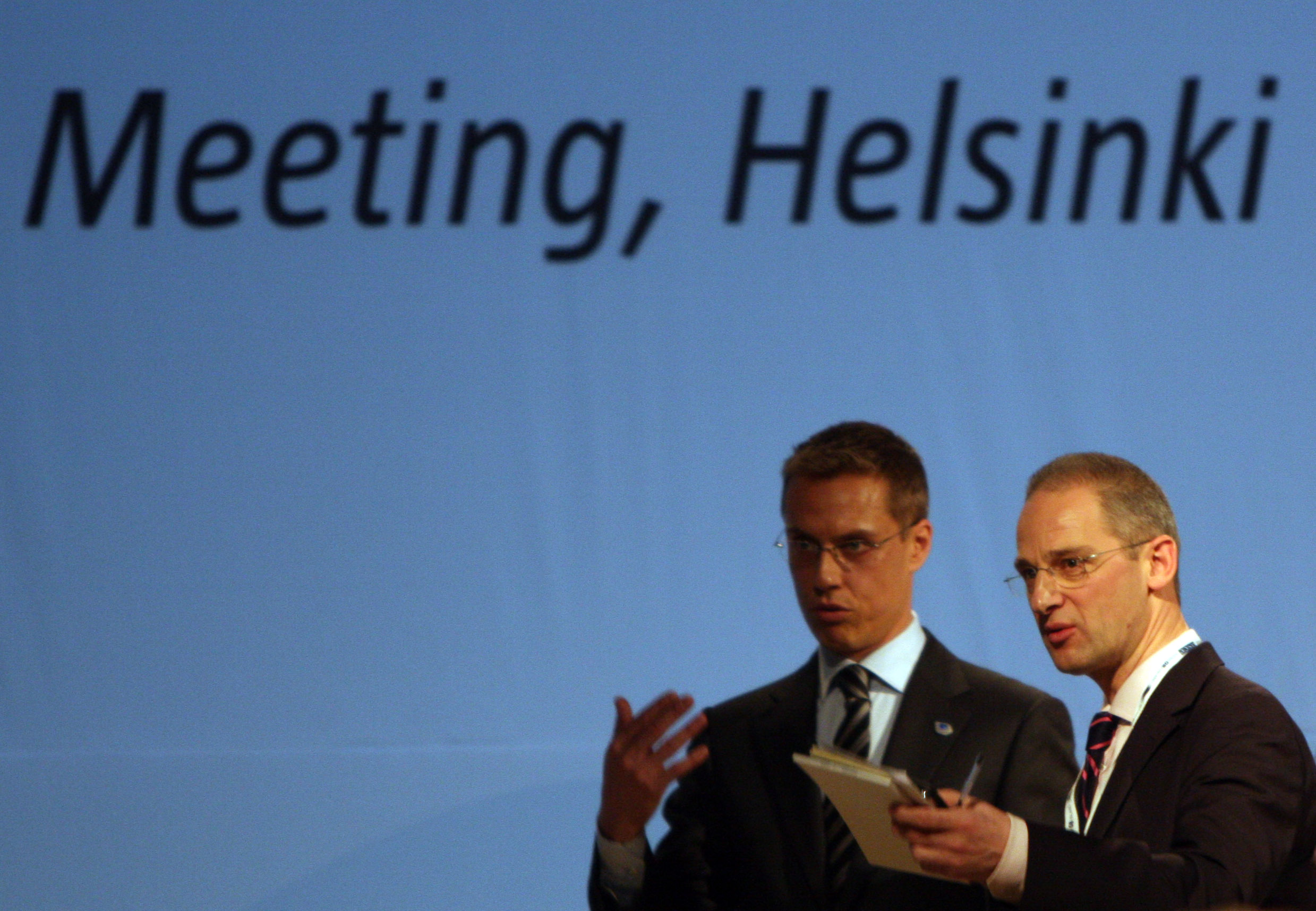 OSCE Chairman Alexander Stubb (left) with his spokesman, Martin Nesirky, at a news conference before the start of the 16th OSCE Ministerial Council, in Helsinki 3 December 2008.
