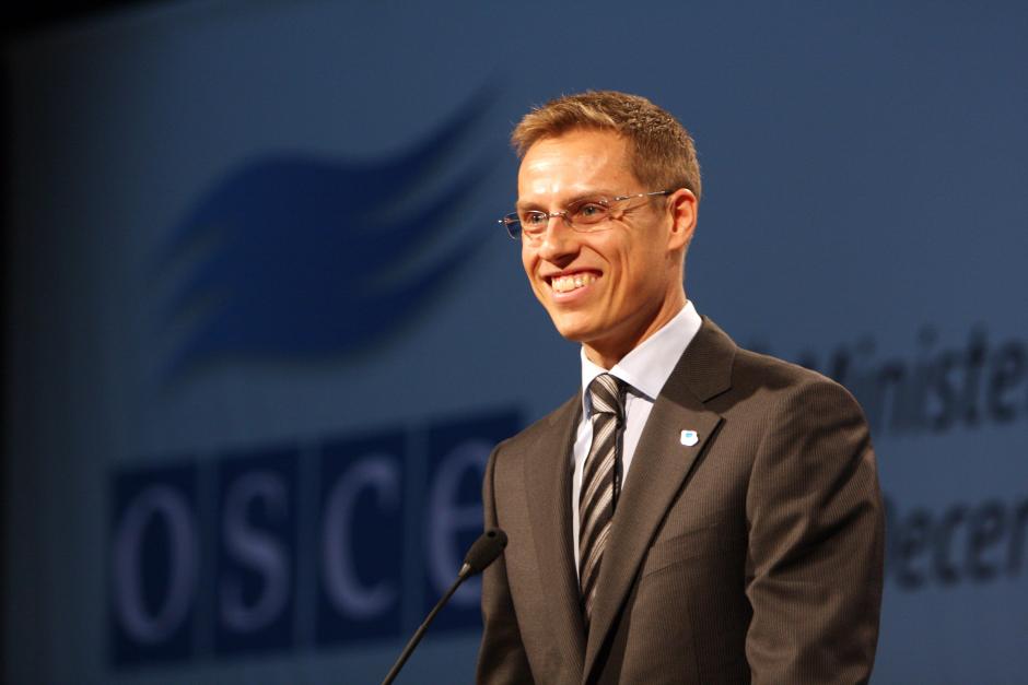 OSCE Chairman-in-Office, Finnish Foreign Minister Alexander Stubb, smiles at a news conference before the start of the 16th OSCE Ministerial Council, in Helsinki, 3 December 2008.